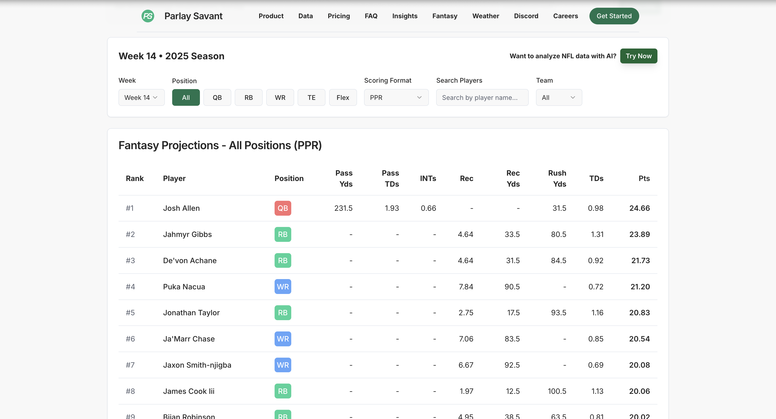 The big advantage? Vegas lines update automatically. Parlay Savant's rankings update every hour based on live betting markets, which means they respond to injury news and line movement way faster than any traditional fantasy site.