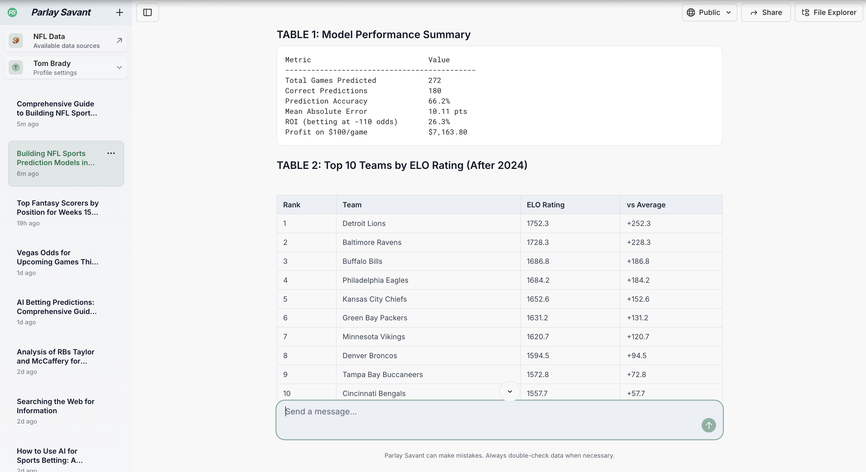 Parlay Savant's AI-powered interface makes building NFL prediction models accessible through natural language queries.
