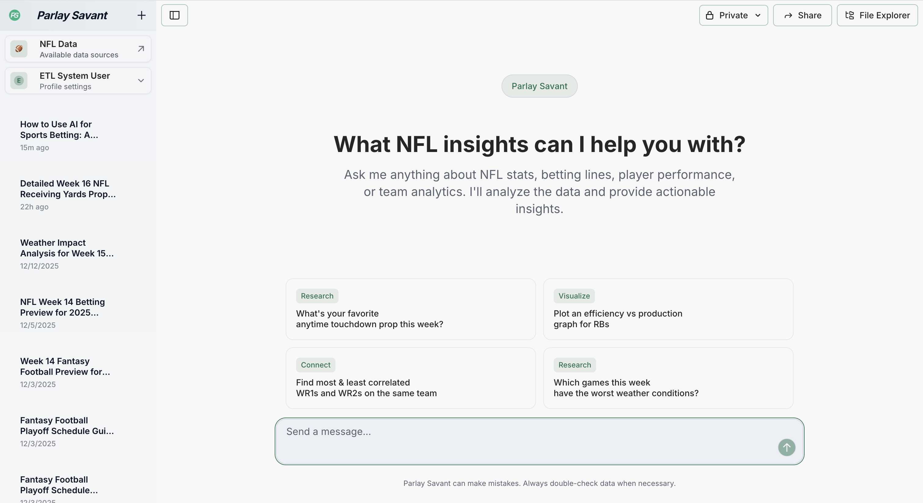 The data used throughout this guide, from team performance metrics to backtesting results, was retrieved and analyzed using Parlay Savant's comprehensive NFL database spanning back to 2020. This AI research tool makes building prediction models dramatically faster and more accurate by handling the technical complexities while you focus on strategic model design.
